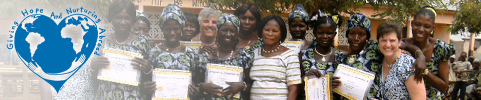 Our Vision: Breaking the cycle of poverty especially through empowering women. Where The Idea Came From In the 1970’s, Giving Hope And Nuturing Abroad co-founder Sharon Wallace served as a missionary nurse midwife in the northern region of Ghana, West Africa for 3 1/2 years. In 2008, Sharon made a return visit to Ghana with co-founder Michele Ciokajlo to work with rural women empowerment efforts and this reignited her desire to improve the lives of people there, and lead to the establishment of Giving Hope And Nurturing Abroad. There have been many improvements over the years such as electricity, a better supply of water, cell phones and the health center is growing with governmental funding for staff. While some progress was visible there were also many needs still evident, especially among women. Women continue to live in poverty, with limited education and few opportunities for employment, especially in the Northern rural areas. The women asked Sharon and Michele to help them learn a trade so they could make money to help provide food, clothing and education for their children. Inspired by their strong spirit and deeply touched by their desire to become self sufficient, Sharon and Michele returned to the U.S. with a new vision and new passion: To help others, help themselves. Our goals are simple